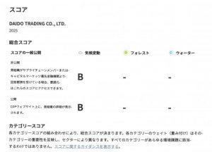 その中でも、「Bスコア」は最高スコアであり、弊社の気候変動への取り組みが高く評価されたことを示しています。